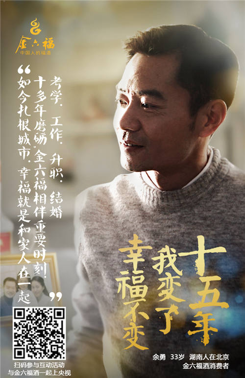 令余勇激动不已的是,为迎接金六福“福高三星”十五年首次全新升级,金六福以“十五年与福同行”为主题,首创真人拍摄广告片互动,鼓励消费者、员工、经销商分享与金六福的幸福故事。而他通过活动平台上传的故事被金六福选中,成为广告片主角之一,登上央视大舞台,用自己的幸福故事,向所有人诠释他的“幸福不变”——幸福就是一家人在一起,就是团圆!