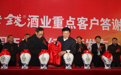 12月9日,榆树钱酒业在其新厂区举行了“重点客户答谢会暨200周年封坛纪念酒发布会”。著名白酒专家高月明,吉林省博物院院长赵瑞军,中国酒业协会副会长栗永清,吉林省酿酒协会会长杨润东,榆树市市委常委、常务副市长高中会,榆树钱酒业董事长汤向阳、酒业总经理徐加龙、销售公司总经理陈炜以及榆树钱酒业重点客户等共计400到会庆贺。