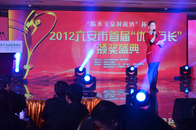 2013年01月23日下午,由六安银监分局、六安市银行业协会、皖西日报社联手主办,安徽临水酒业独家冠名的“临水玉泉洞藏酒”杯2012六安市首届“优秀行长”颁奖典礼在六安西海生态园度假酒店隆重举行。19位六安银行业的精英们获得了“优秀行长”荣誉,10位获得了六安市“十佳行长”称号。