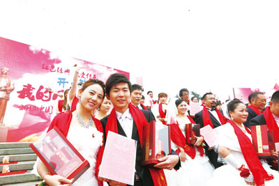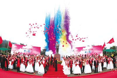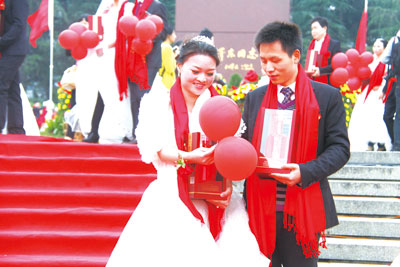 11 月10 日上午,两个巨大的红“囍”字将韶山毛泽东广场装点得喜气洋洋。百位新人手捧红色证书,宣誓结婚。每一位新人都将自己的爱情箴言投入箴言箱中,这些箴言将被封存在韶山,七年之后才能打开。